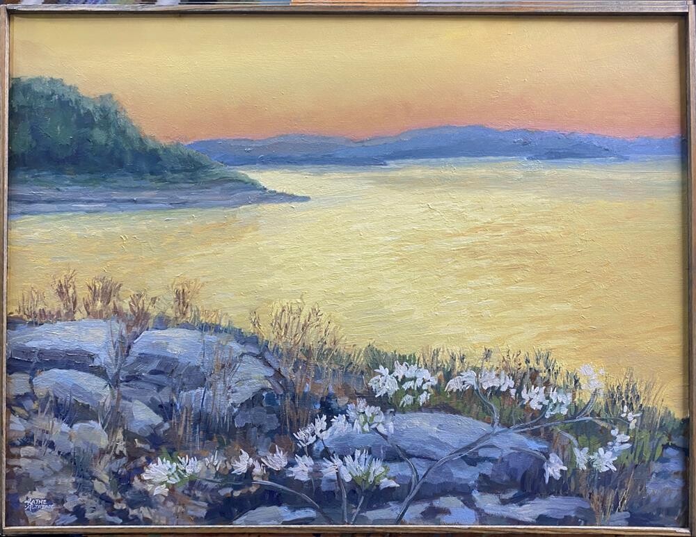 Wildflowers in bloom alongside Bull Shoals Lake in Arkansas at sunset.