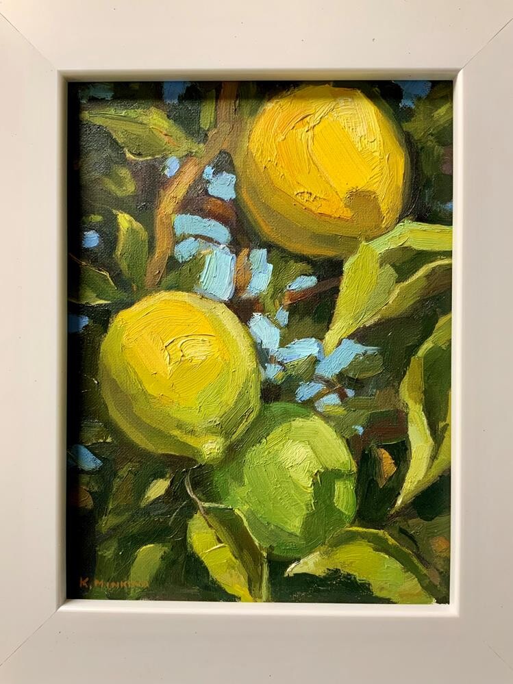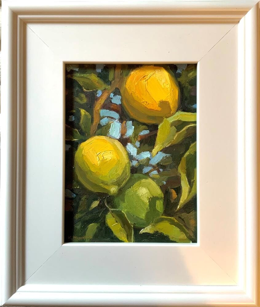 I painted this 8x6 study back when I lived on Maui, working directly from life. The light that morning was clear and warm, giving the lemons a natural luminosity that made the whole scene feel alive. I focused on strong, economical brushwork and letting the color relationships carry the painting rather than over-refining anything. I love the way plein air paintings come out so fresh and immediate, they always always take me back to the moment they were made — the quiet, the shifting light, and the challenge of capturing something honest before it changes. This little study still feels like a snapshot of that place and that morning, held in paint.