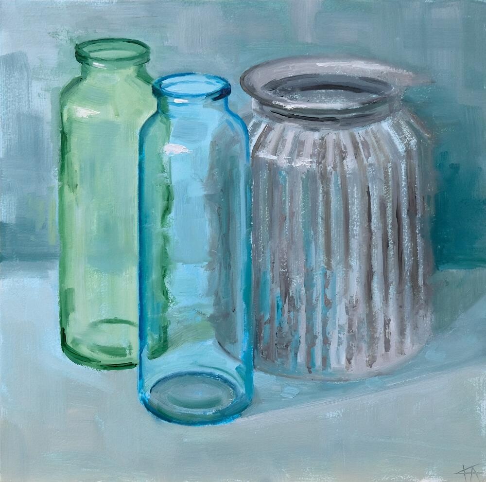 These vases were actually a lucky find. I was just on my way to pick something up from the pharmacy when I noticed in passing that my favorite flower shop was closed for renovations. There was a sign on the door with an announcement, and in front of the shop was a large cart with lots of glass vases that were being taken out of inventory. It may sound silly, but you can't imagine how excited I was about these vases! I had been wanting to paint a series of still lifes with glass pieces like these for a long time, but I didn't have anything suitable at home. And here, right in front of me, were the perfect subjects for study--at bargain prices! I could hardly believe my luck! I rushed to the pharmacy and back, for some reason afraid that they might all be gone, even though I knew that was ridiculous - There were at least a hundred vases there in all shapes and sizes! It wasn't easy to choose just a few of them. But I knew I didn't have unlimited space for storage, nor the time to paint them all. So, I chose six, paid for them, and packed them carefully into my shopping bag. I started painting the very next day. The series isn't finished yet because I was interrupted for a commissioned piece, but I'm looking forward to returning to my beautiful new vases soon. These vases were actually a lucky find. I was just on my way to pick something up from the pharmacy when I noticed in passing that my favorite flower shop was closed for renovations. There was a sign on the door with an announcement, and in front of the shop was a large cart with lots of glass vases that were being taken out of inventory. It may sound silly, but you can't imagine how excited I was about these vases! I had been wanting to paint a series of still lifes with glass pieces like these for a long time, but I didn't have anything suitable at home. And here, right in front of me, were the perfect subjects for study--at bargain prices! I could hardly believe my luck! I rushed to the pharmacy and back, for some reason afraid that they might all be gone, even though I knew that was ridiculous - There were at least a hundred vases there in all shapes and sizes! It wasn't easy to choose just a few of them. But I knew I didn't have unlimited space for storage, nor the time to paint them all. So, I chose six, paid for them, and packed them carefully into my shopping bag. I started painting the very next day. The series isn't finished yet because I was interrupted for a commissioned piece, but I'm looking forward to returning to my beautiful new vases soon. |