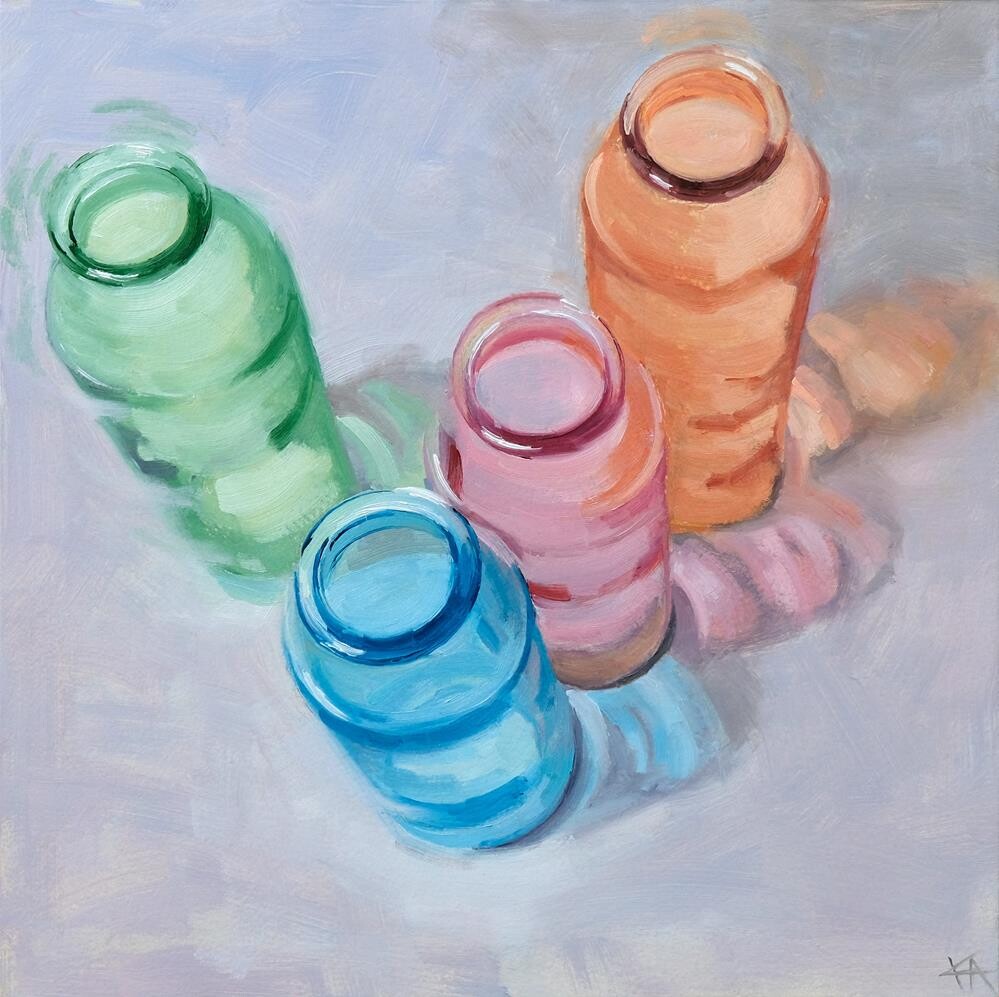 These vases were actually a lucky find. I was just on my way to pick something up from the pharmacy when I noticed in passing that my favorite flower shop was closed for renovations. There was a sign on the door with an announcement, and in front of the shop was a large cart with lots of glass vases that were being taken out of inventory. It may sound silly, but you can't imagine how excited I was about these vases! I had been wanting to paint a series of still lifes with glass pieces like these for a long time, but I didn't have anything suitable at home. And here, right in front of me, were the perfect subjects for study--at bargain prices! I could hardly believe my luck! I rushed to the pharmacy and back, for some reason afraid that they might all be gone, even though I knew that was ridiculous - There were at least a hundred vases there in all shapes and sizes! It wasn't easy to choose just a few of them. But I knew I didn't have unlimited space for storage, nor the time to paint them all. So, I chose six, paid for them, and packed them carefully into my shopping bag. I started painting the very next day. The series isn't finished yet because I was interrupted for a commissioned piece, but I'm looking forward to returning to my beautiful new vases soon. These vases were actually a lucky find. I was just on my way to pick something up from the pharmacy when I noticed in passing that my favorite flower shop was closed for renovations. There was a sign on the door with an announcement, and in front of the shop was a large cart with lots of glass vases that were being taken out of inventory. It may sound silly, but you can't imagine how excited I was about these vases! I had been wanting to paint a series of still lifes with glass pieces like these for a long time, but I didn't have anything suitable at home. And here, right in front of me, were the perfect subjects for study--at bargain prices! I could hardly believe my luck! I rushed to the pharmacy and back, for some reason afraid that they might all be gone, even though I knew that was ridiculous - There were at least a hundred vases there in all shapes and sizes! It wasn't easy to choose just a few of them. But I knew I didn't have unlimited space for storage, nor the time to paint them all. So, I chose six, paid for them, and packed them carefully into my shopping bag. I started painting the very next day. The series isn't finished yet because I was interrupted for a commissioned piece, but I'm looking forward to returning to my beautiful new vases soon. |
