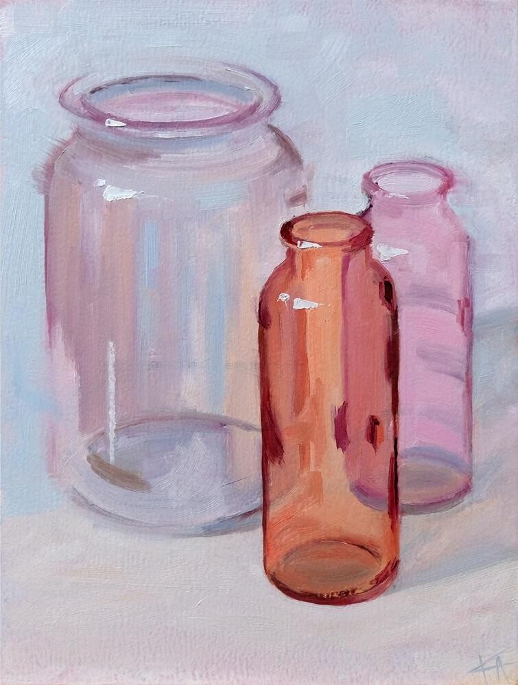 These vases were actually a lucky find. I was just on my way to pick something up from the pharmacy when I noticed in passing that my favorite flower shop was closed for renovations. There was a sign on the door with an announcement, and in front of the shop was a large cart with lots of glass vases that were being taken out of inventory. It may sound silly, but you can't imagine how excited I was about these vases! I had been wanting to paint a series of still lifes with glass pieces like these for a long time, but I didn't have anything suitable at home. And here, right in front of me, were the perfect subjects for study--at bargain prices! I could hardly believe my luck! I rushed to the pharmacy and back, for some reason afraid that they might all be gone, even though I knew that was ridiculous - There were at least a hundred vases there in all shapes and sizes! It wasn't easy to choose just a few of them. But I knew I didn't have unlimited space for storage, nor the time to paint them all. So, I chose six, paid for them, and packed them carefully into my shopping bag. I started painting the very next day. The series isn't finished yet because I was interrupted for a commissioned piece, but I'm looking forward to returning to my beautiful new vases soon. These vases were actually a lucky find. I was just on my way to pick something up from the pharmacy when I noticed in passing that my favorite flower shop was closed for renovations. There was a sign on the door with an announcement, and in front of the shop was a large cart with lots of glass vases that were being taken out of inventory. It may sound silly, but you can't imagine how excited I was about these vases! I had been wanting to paint a series of still lifes with glass pieces like these for a long time, but I didn't have anything suitable at home. And here, right in front of me, were the perfect subjects for study--at bargain prices! I could hardly believe my luck! I rushed to the pharmacy and back, for some reason afraid that they might all be gone, even though I knew that was ridiculous - There were at least a hundred vases there in all shapes and sizes! It wasn't easy to choose just a few of them. But I knew I didn't have unlimited space for storage, nor the time to paint them all. So, I chose six, paid for them, and packed them carefully into my shopping bag. I started painting the very next day. The series isn't finished yet because I was interrupted for a commissioned piece, but I'm looking forward to returning to my beautiful new vases soon. |