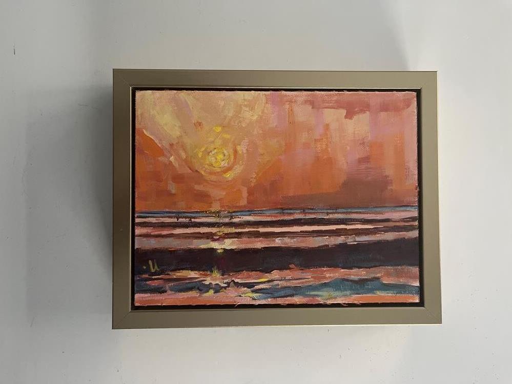 Beautifully back lit evening sky large brush strokes that melt into the background with a touch of violet. Tiny images of figures walking the sandbars. Framed floater franken frame! 1.5” deep 1/2 w Beautifully back lit evening sky large brush strokes that melt into the background with a touch of violet. Tiny images of figures walking the sandbars. Framed floater franken frame! 1.5” deep 1/2 w |