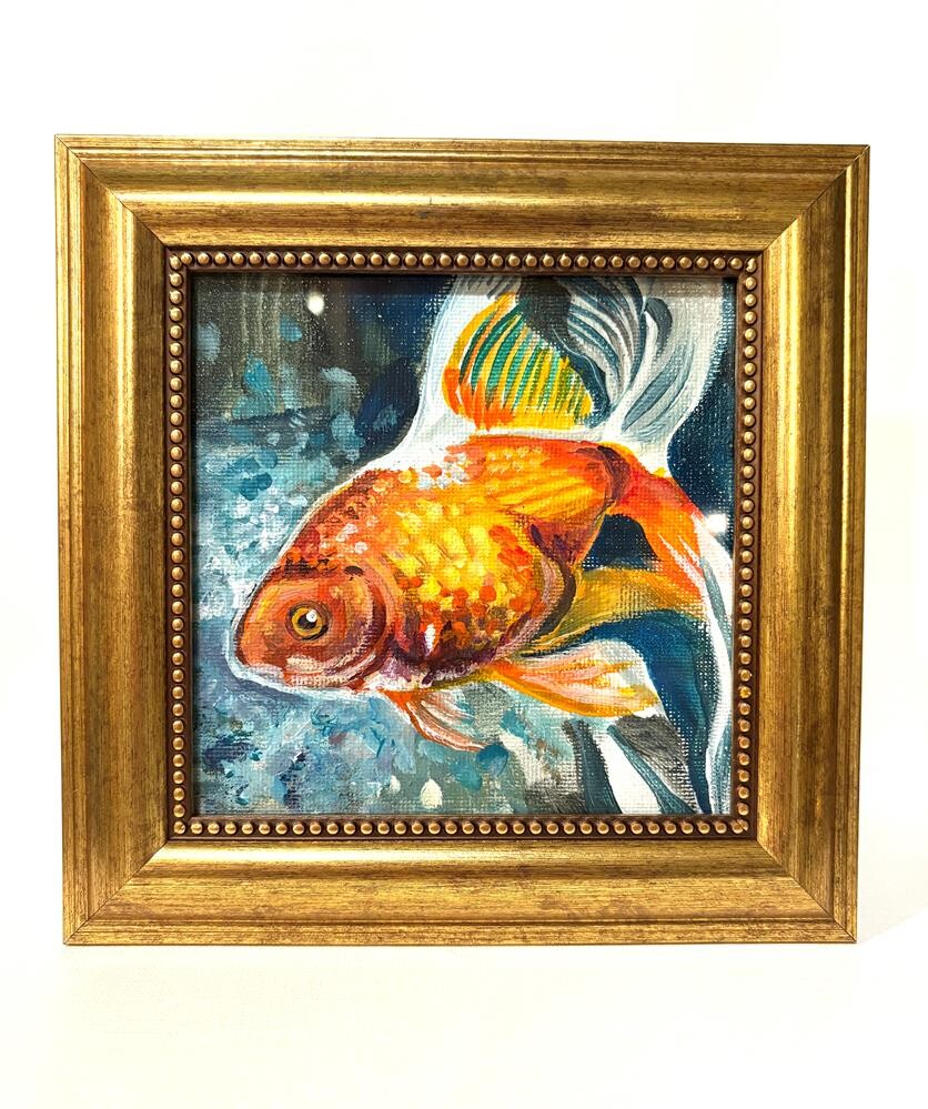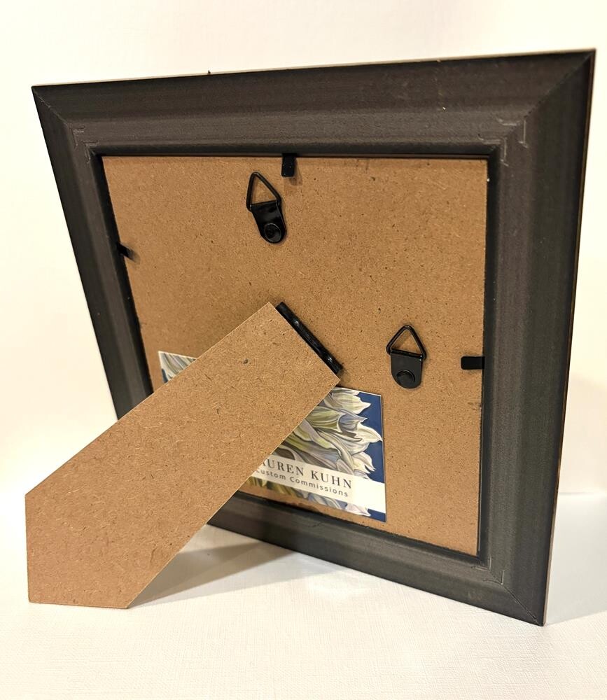 Artwork measures 4.5" square, frame measures 7 square. Pretty, simple, recycled/upcycled gold frame, framed under glass. Artwork measures 4.5" square, frame measures 7 square. Pretty, simple, recycled/upcycled gold frame, framed under glass. |