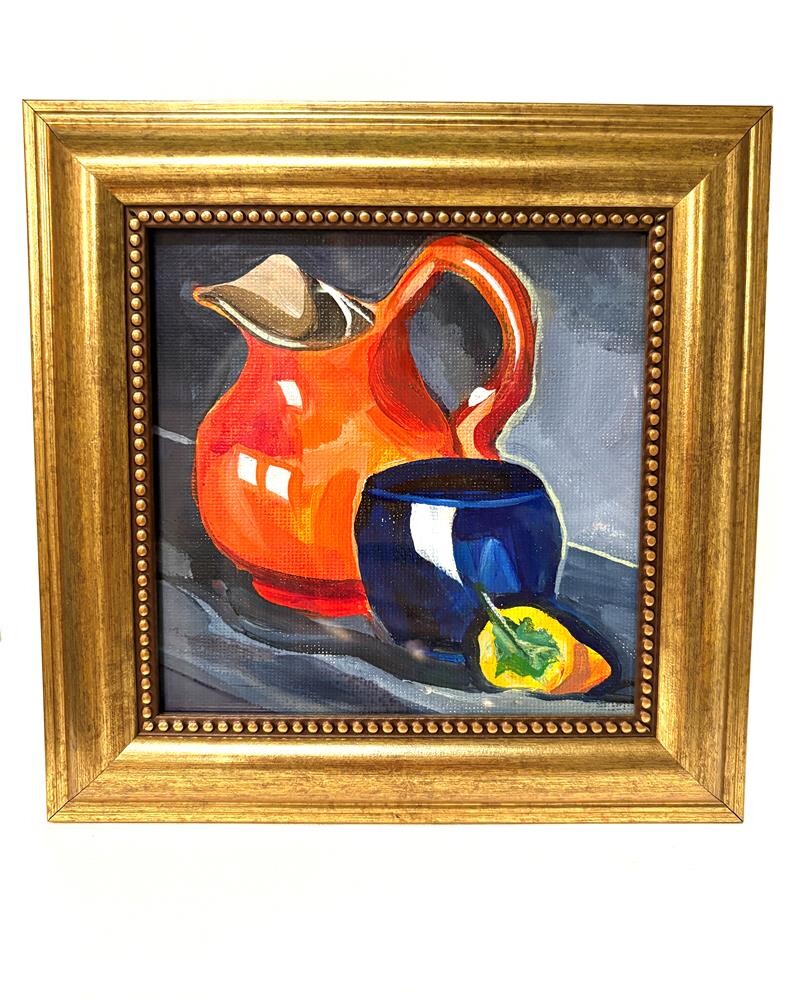 Artwork measures 4.5" square, frame measures 7 square. Clean, simple, recycled/upcycled gold frame, framed under glass. Artwork measures 4.5" square, frame measures 7 square. Clean, simple, recycled/upcycled gold frame, framed under glass. |