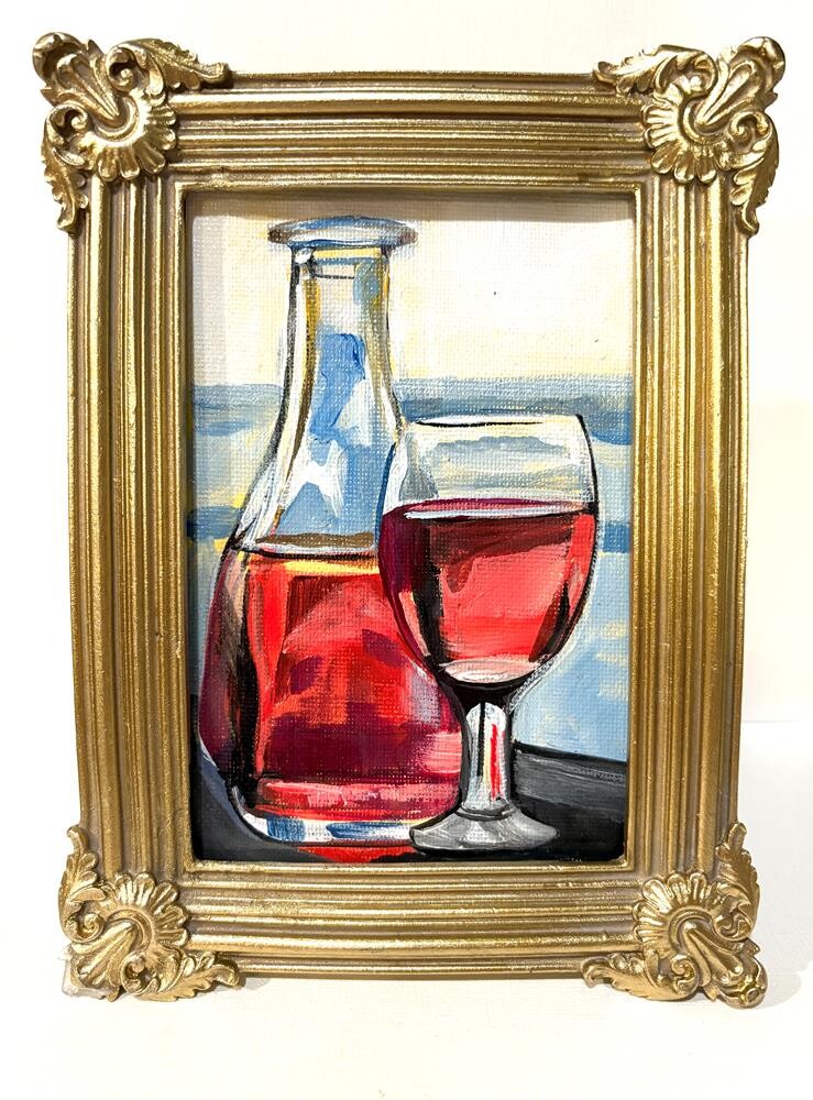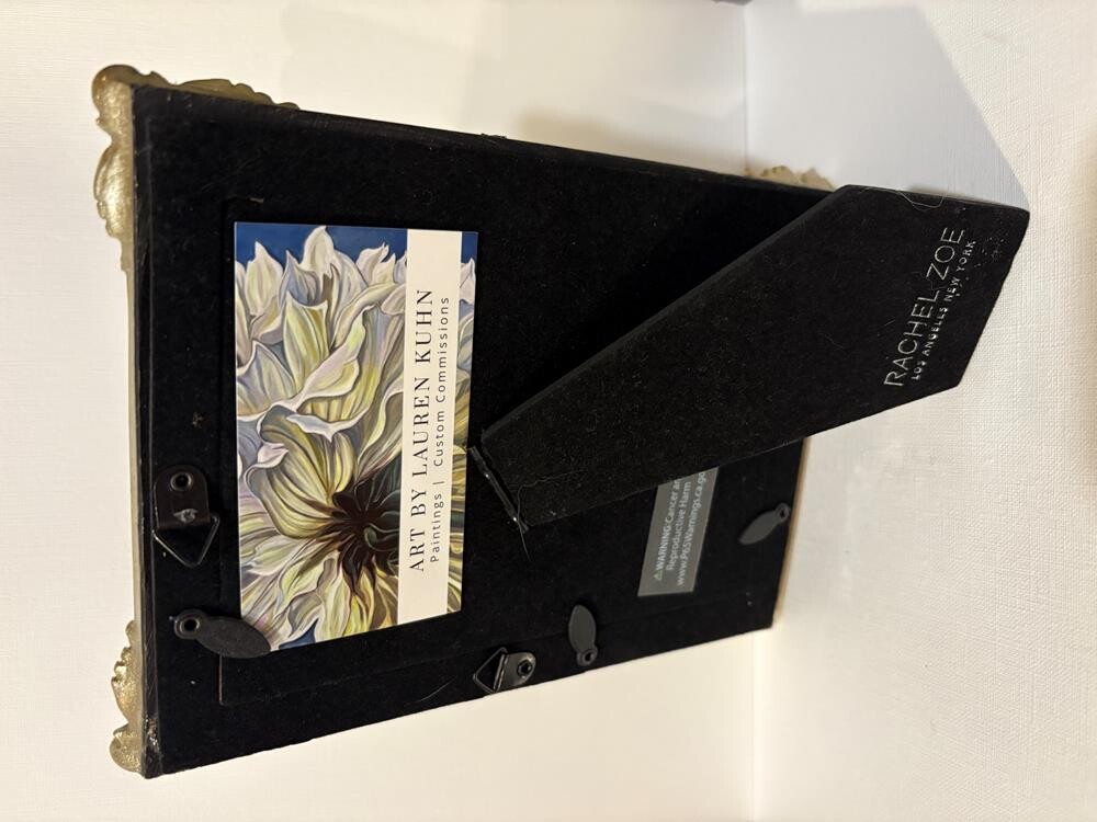Artwork measures 4 x 5.5, frame measures 5.75 x 7.75. Unique, classical, recycled/upcycled gold frame with ornate scroll work and flared corners, framed under glass. Artwork measures 4 x 5.5, frame measures 5.75 x 7.75. Unique, classical, recycled/upcycled gold frame with ornate scroll work and flared corners, framed under glass. |