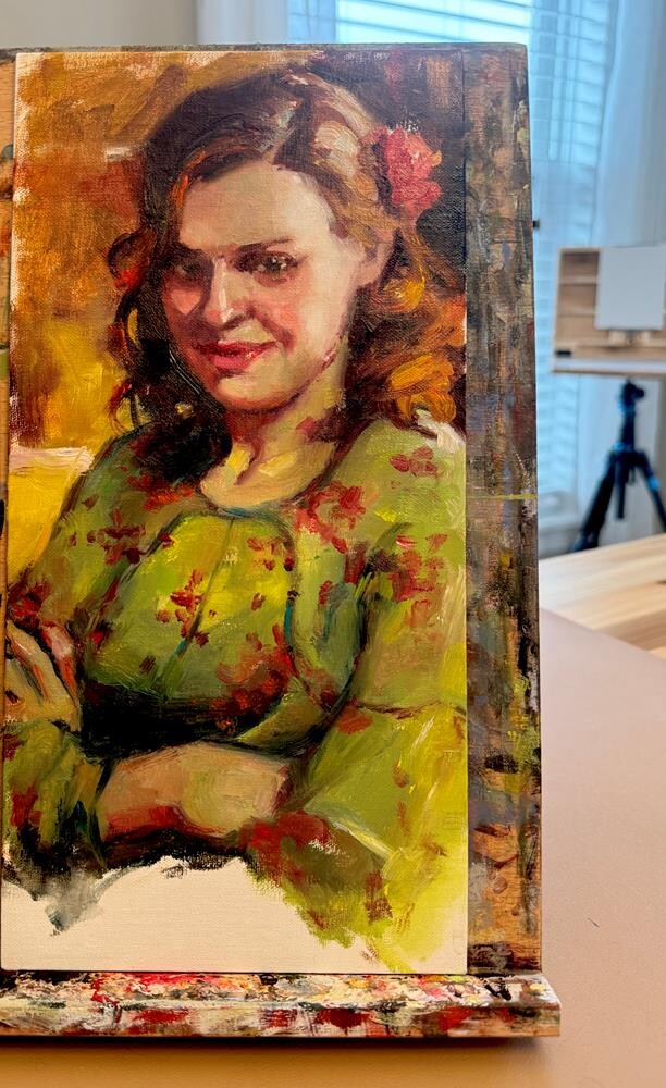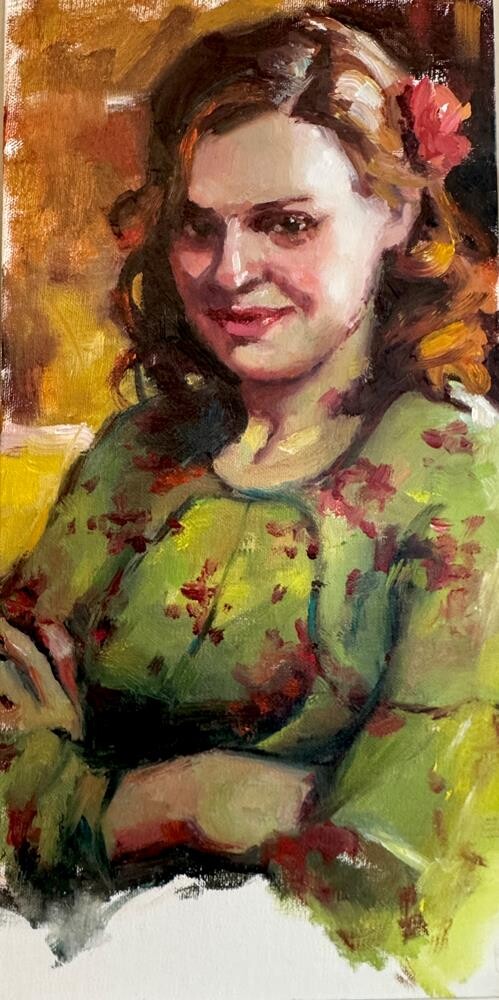 I was watching something on TV and paused the screen immediately because I knew I had to paint this woman! Those colors - greens and oranges - yum! Such a fun painting to do! I was watching something on TV and paused the screen immediately because I knew I had to paint this woman! Those colors - greens and oranges - yum! Such a fun painting to do! |