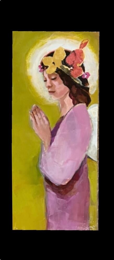 I have been creating a series of angels and spiritual beings, and she is up next! She is painted on a 14x6 cradled board and has 1 1/2 “ sides which are left in the natural wood state. Her hair flowers are collages. The sides are sealed and protected. No framing needed. It is wired for hanging, but can also be displayed sitting on a shelf, with or without an easel. Scroll to the second photo to see the current group together. These would make beautiful Christmas gifts, or for anyone, anytime, who loves mothers, babies, angels, and Jesus!