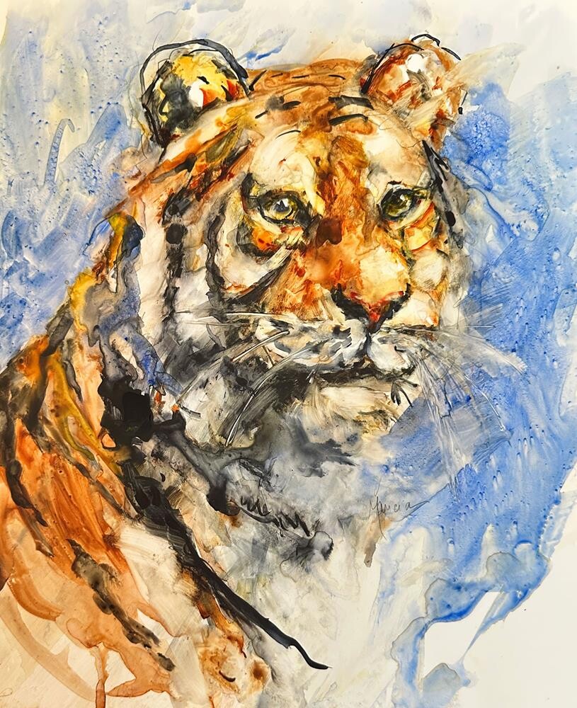 This tiger is painted on Yupo paper with watercolor. Painting on Yupo is quite challenging as the paint does not soak into the paper but sits on the surface and moves about freely so that unique textures and patterns are created. I love the unique effect. A fixative has been applied but the painting would require to be framed with glass as the watercolor could be reactivated with water. This tiger is painted on Yupo paper with watercolor. Painting on Yupo is quite challenging as the paint does not soak into the paper but sits on the surface and moves about freely so that unique textures and patterns are created. I love the unique effect. A fixative has been applied but the painting would require to be framed with glass as the watercolor could be reactivated with water. |