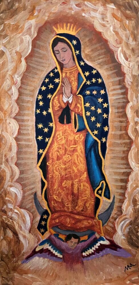 My version of Our Lady of Guadalupe, displaying the symbols of her image when she appeared. My friend requested that I paint this for her, and this painting also matched the Lady Guadalupe pillows that she got in Chile. My version of Our Lady of Guadalupe, displaying the symbols of her image when she appeared. My friend requested that I paint this for her, and this painting also matched the Lady Guadalupe pillows that she got in Chile. |