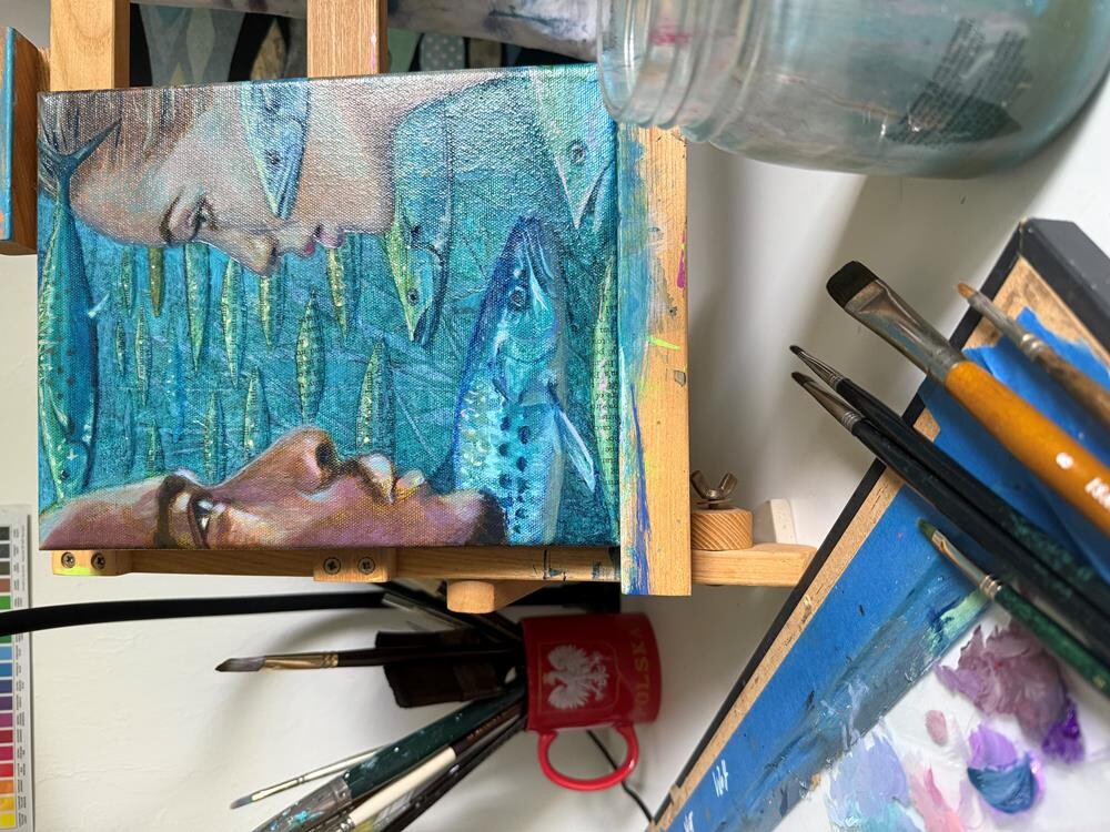 This painting started when I was doing a demo on transparent acrylic washes. It wasn’t intentional but then the faces emerged and I had to continue painting. I added collage using previously made gelli prints and newsprint, followed by acrylics and finished with juicy oil paints. “Deep Conversation” portrays the subject of communication and human connection. Fish is my go-to as I try to give voice to the voiceless. I grew up in Poland where I was often reminded that “kids and fish don’t have a voice.” I don’t think it’s true so I’ve been exploring this idea ever since. This painting started when I was doing a demo on transparent acrylic washes. It wasn’t intentional but then the faces emerged and I had to continue painting. I added collage using previously made gelli prints and newsprint, followed by acrylics and finished with juicy oil paints. “Deep Conversation” portrays the subject of communication and human connection. Fish is my go-to as I try to give voice to the voiceless. I grew up in Poland where I was often reminded that “kids and fish don’t have a voice.” I don’t think it’s true so I’ve been exploring this idea ever since. |
