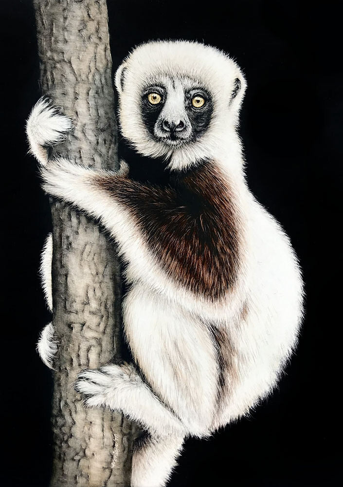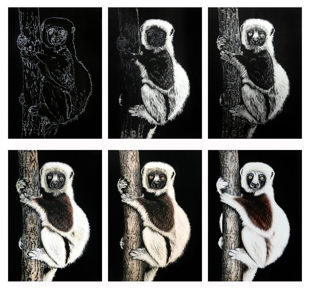 This piece was created on Ampersand scratchboard with various sharp tools. I scratch away the top layer of black India ink to varying degrees, then add colored India ink and scratch again. This process is done several times to create depth of color. It was sealed with several layers of satin varnish for protection and so it doesn't need to be under glass.