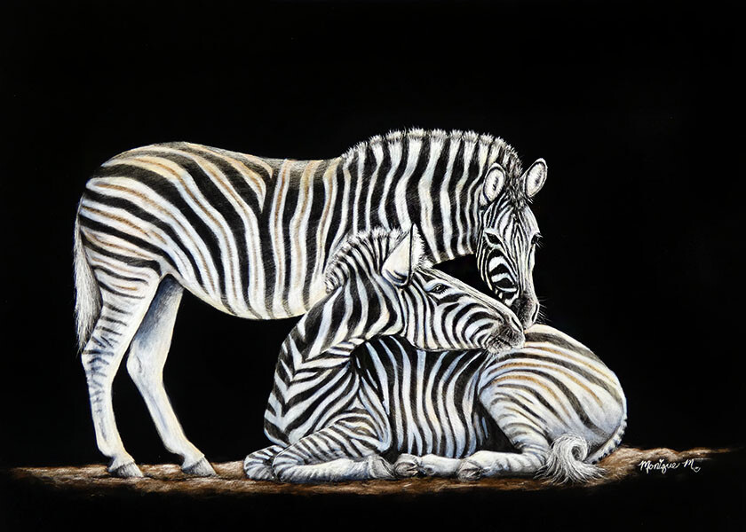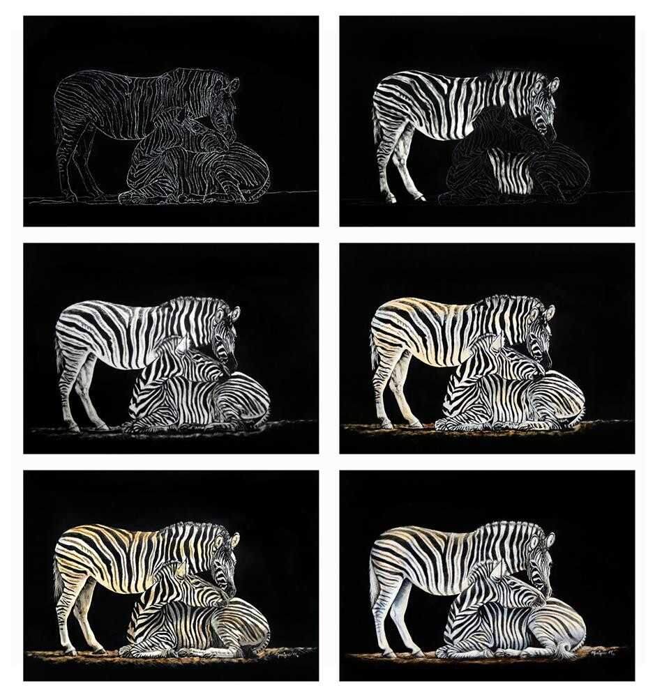 This piece was created on Ampersand scratchboard with various sharp tools. I scratch away the top layer of black India ink to varying degrees, then add colored India ink and scratch again. This process is done several times to create depth of color. It was sealed with several layers of satin varnish for protection and so it doesn't need to be under glass.