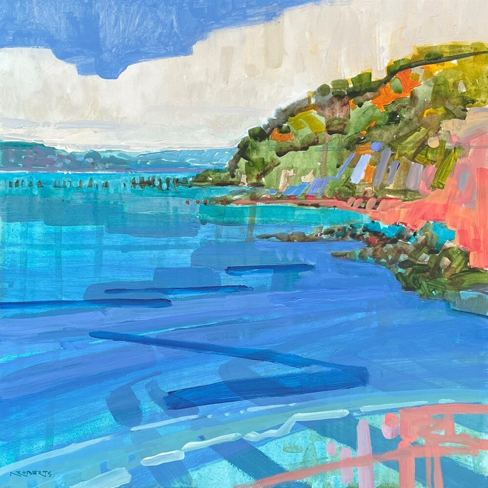 I love painting at Eckley Pier in Crockett, CA, with views across the Carquinez Strait to Benicia. When the tide is out bits of old bricks, broken crockery and sea glass turn the beach into a treasure trove. Acrylic on Ampersand Gessobord panel, 12" x 12", in a maple floater frame. This painting will be available at Valley Art Gallery in Walnut Creek, CA, beginning March 7, 2026.