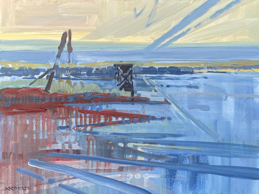 I loved the soft red river plants hugging the cove on a silvery afternoon out at Big Break. Quiet, peaceful -- a favorite spot. Acrylic on Ampersand Gessobord panel, 9" x 12", in a maple floater frame.