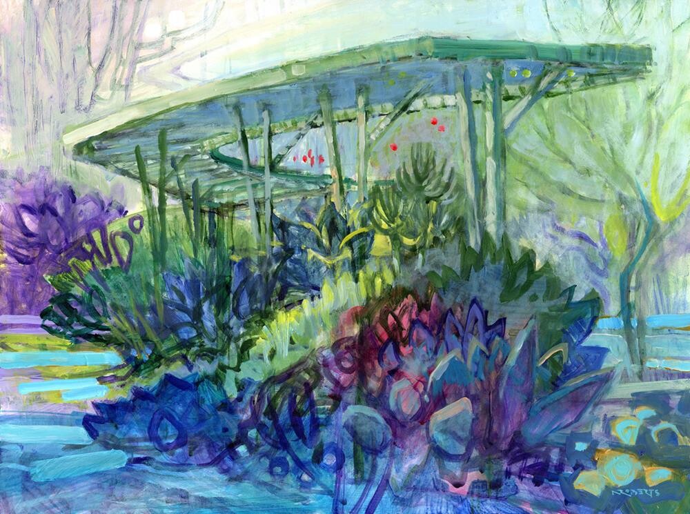 I love the retro, swooping lines and organic, tree-like structure of this curving trellis. It protects a tender colony of colorful plants with its sheltering embrace. Painted during my Fall 2024 artist residency at the beautiful Ruth Bancroft Garden in Walnut Creek, California. Acrylic on Ampersand Gessobord panel, 12" x 16" in a maple floater frame. This painting is available at Valley Art Gallery in Walnut Creek, California. I love the retro, swooping lines and organic, tree-like structure of this curving trellis. It protects a tender colony of colorful plants with its sheltering embrace. Painted during my Fall 2024 artist residency at the beautiful Ruth Bancroft Garden in Walnut Creek, California. Acrylic on Ampersand Gessobord panel, 12" x 16" in a maple floater frame. This painting is available at Valley Art Gallery in Walnut Creek, California. |