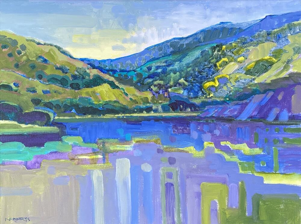 Lake Del Valle is the centerpiece of Del Valle Regional Park, a beautiful nature preserve tucked into the East Bay hills just south of Livermore. It was a joy to paint there on a sparkling -- and very windy! -- early June day. Acrylic on canvas in a contemporary white frame. Lake Del Valle is the centerpiece of Del Valle Regional Park, a beautiful nature preserve tucked into the East Bay hills just south of Livermore. It was a joy to paint there on a sparkling -- and very windy! -- early June day. Acrylic on canvas in a contemporary white frame. |