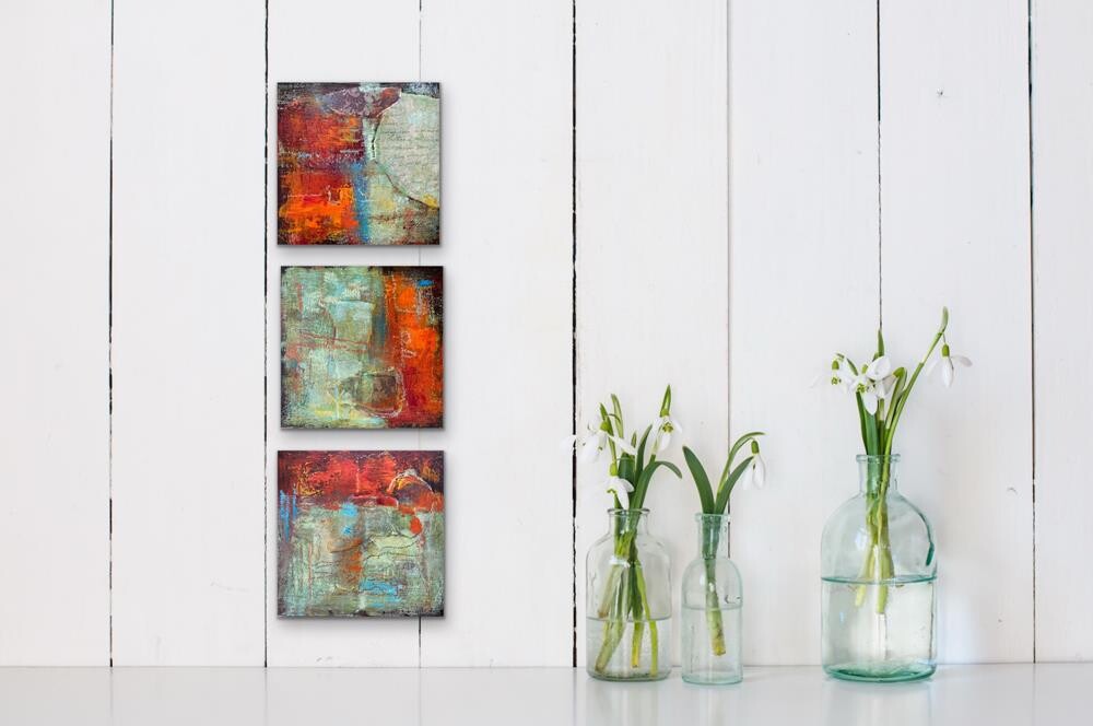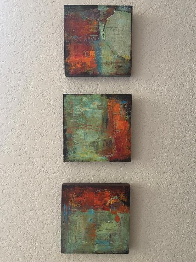 Triptych on cradled wood in hues of oranges and greens. Triptych on cradled wood in hues of oranges and greens. |