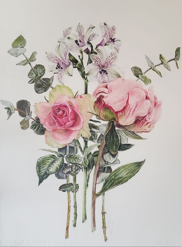 A colored pencil study on hot press watercolor paper of a rose, peony, eucalyptus, and alstromeria. A colored pencil study on hot press watercolor paper of a rose, peony, eucalyptus, and alstromeria. |