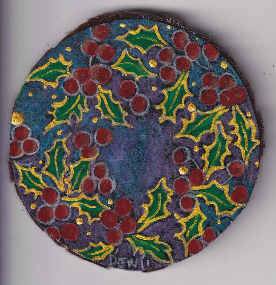 Christmas ornament, 3" diameter, stringed, on wood circle, gold painted outline Christmas ornament, 3" diameter, stringed, on wood circle, gold painted outline |