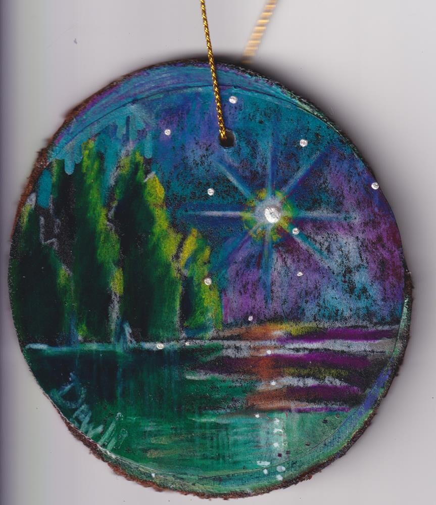 Christmas ornament, 3" diameter, stringed, on wood circle. Christmas ornament, 3" diameter, stringed, on wood circle. |