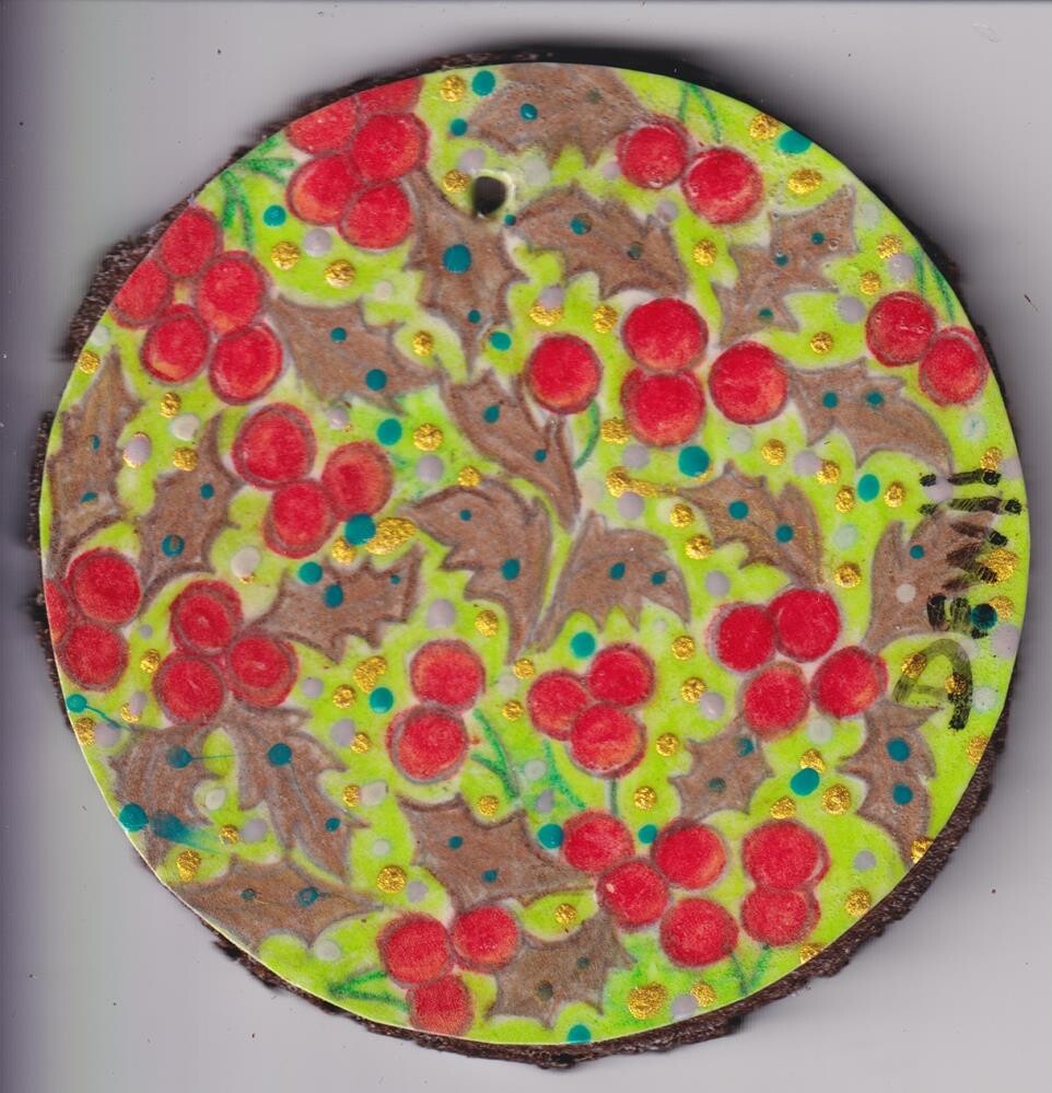 Christmas ornament, 3" diameter, stringed, on wood circle Christmas ornament, 3" diameter, stringed, on wood circle |