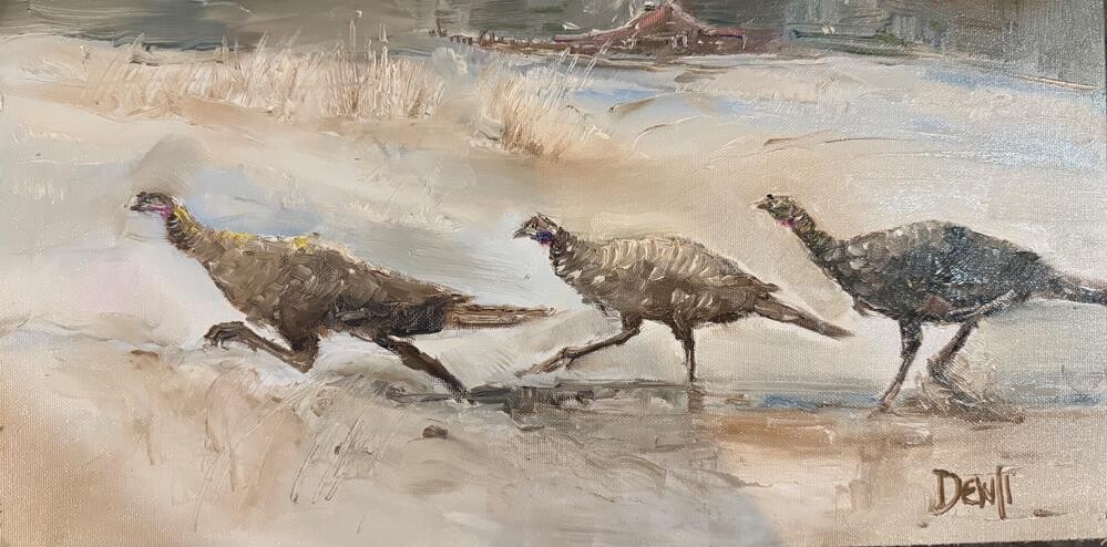 3 wild Turkeys on a cold morning in Minnesota, 8"x16" Water Soluble Oil painting on panel board 3 wild Turkeys on a cold morning in Minnesota, 8"x16" Water Soluble Oil painting on panel board |