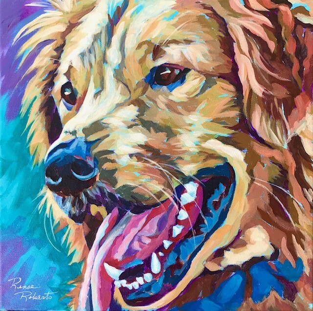 This happy fellow is ready to run and fetch the ball for you! Painted in vibrant colors on a background of teal and lavender. This happy fellow is ready to run and fetch the ball for you! Painted in vibrant colors on a background of teal and lavender. |