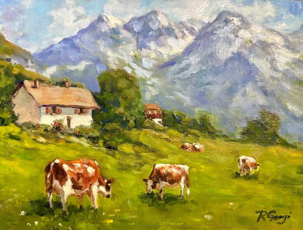 An original oil painting depicting a peaceful alpine landscape with grazing cows in a sunlit meadow. Soft, painterly brushstrokes capture the freshness of mountain air, rolling green fields, and distant blue peaks partially veiled by clouds. Oil on canvas board. Custom size or details available upon request. An original oil painting depicting a peaceful alpine landscape with grazing cows in a sunlit meadow. Soft, painterly brushstrokes capture the freshness of mountain air, rolling green fields, and distant blue peaks partially veiled by clouds. Oil on canvas board. Custom size or details available upon request. |