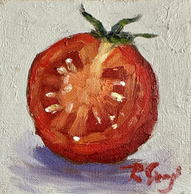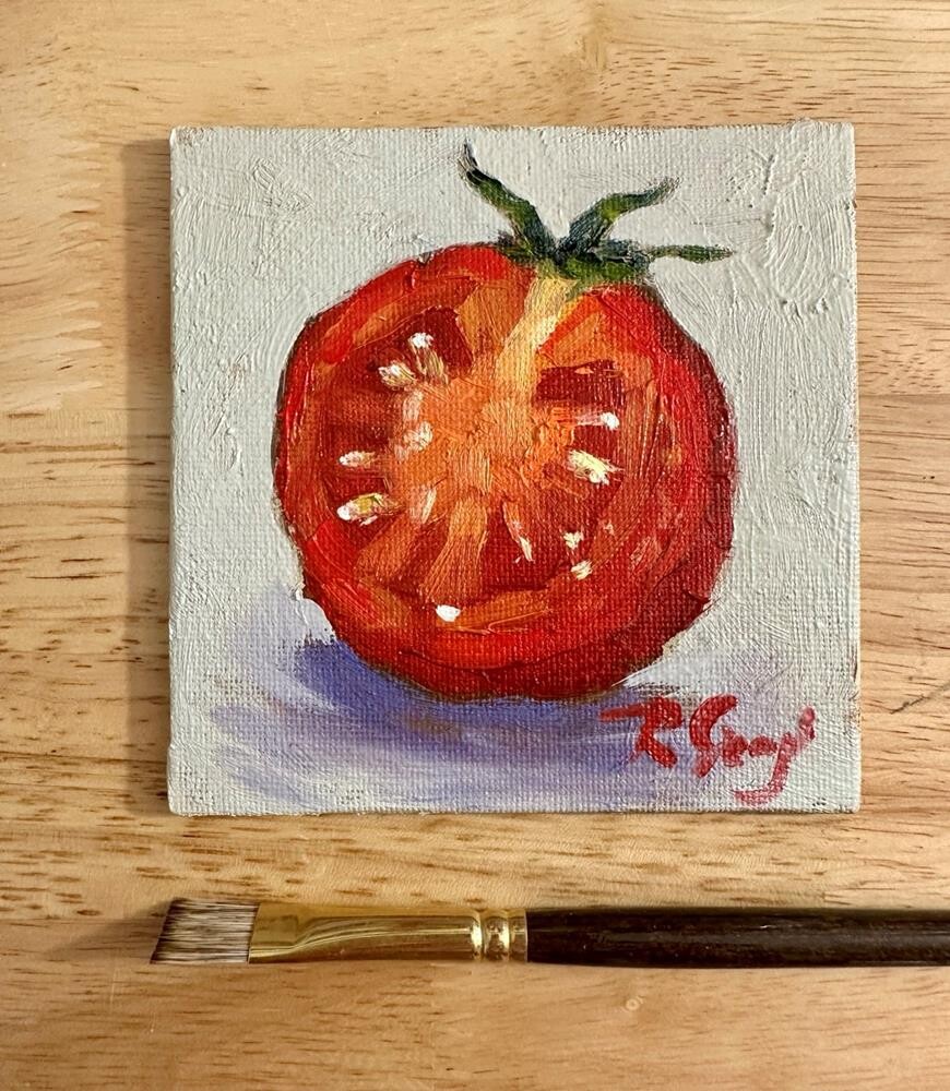 Original oil painting on a canvas panel. A joyful little oil painting of a ripe summer tomato, painted with expressive brushstrokes and warm colors. I can create a similar piece in any size upon request. π π¨