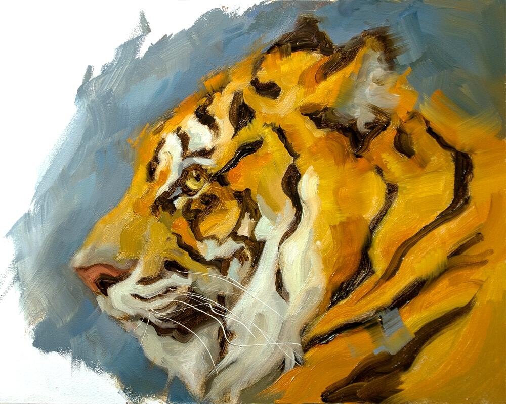 This painting was built intuitively, beginning with a loose underpainting and gradually resolving through larger shapes before moving into smaller passages and color relationships. I focused on restraint, letting the form emerge without overworking detail. The tiger’s gaze reflects a calm, internal power rather than aggression. I was interested in capturing presence and stillness, allowing the brushwork to remain visible and expressive, reinforcing the sense of contained energy rather than spectacle. This painting was built intuitively, beginning with a loose underpainting and gradually resolving through larger shapes before moving into smaller passages and color relationships. I focused on restraint, letting the form emerge without overworking detail. The tiger’s gaze reflects a calm, internal power rather than aggression. I was interested in capturing presence and stillness, allowing the brushwork to remain visible and expressive, reinforcing the sense of contained energy rather than spectacle. |