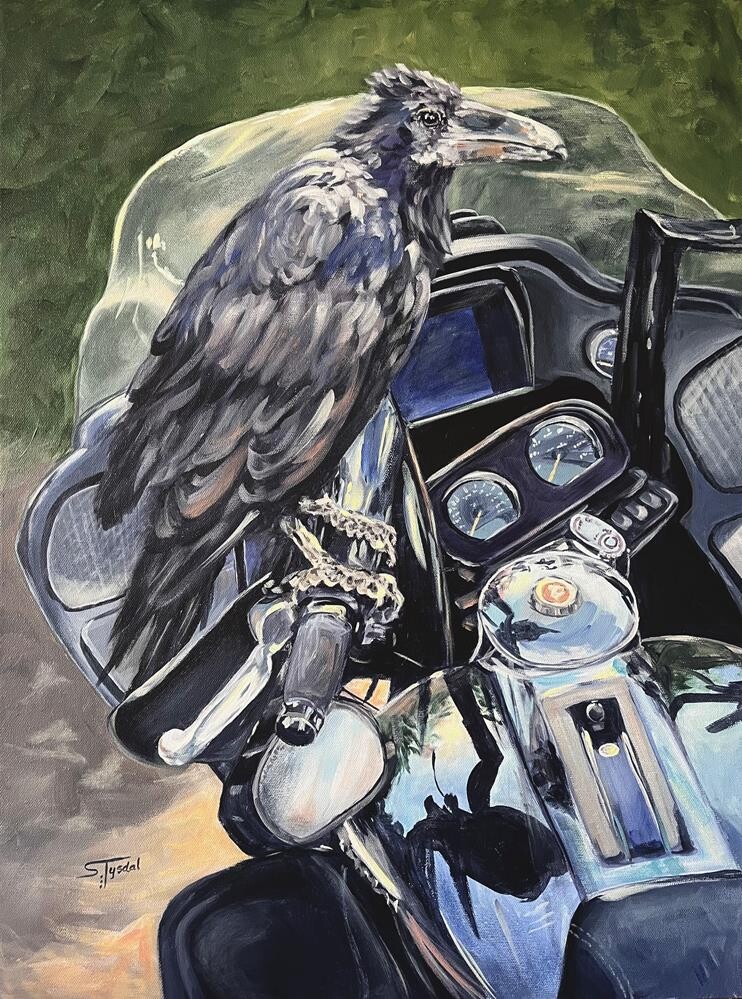 This painting is available for sale through the Federation Gallery . You can contact them at: sales@artists.ca While visiting Yellowstone National Park this summer, I came across this raven sitting on a black motorcycle in the parking lot and grabbed the rare moment with my camera.
