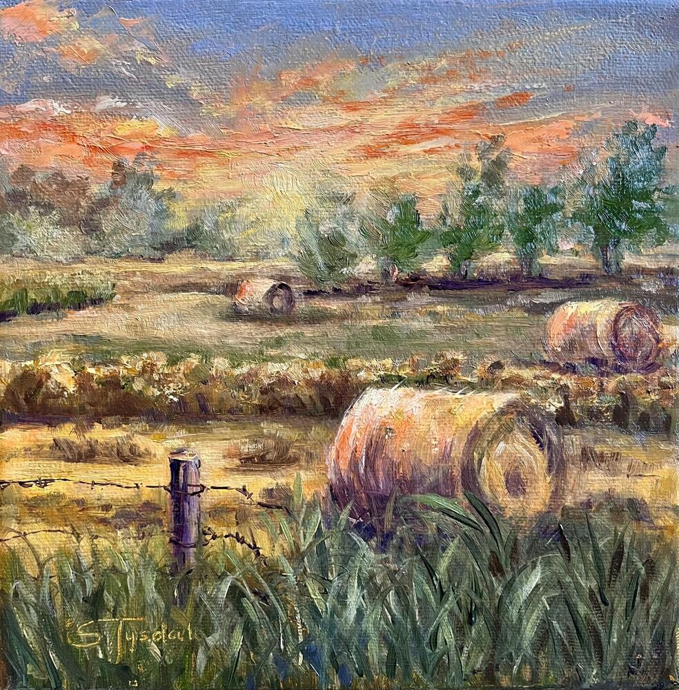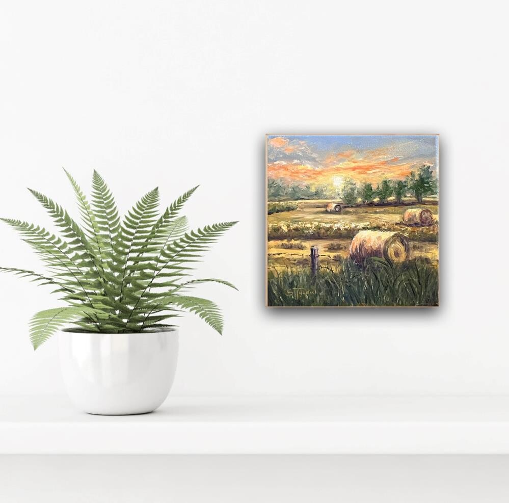 About August on the prairies you will see lots of straw bales in the landscape. It is a very busy season for the farmers. This painting is in a natural floating frame. About August on the prairies you will see lots of straw bales in the landscape. It is a very busy season for the farmers. This painting is in a natural floating frame. |