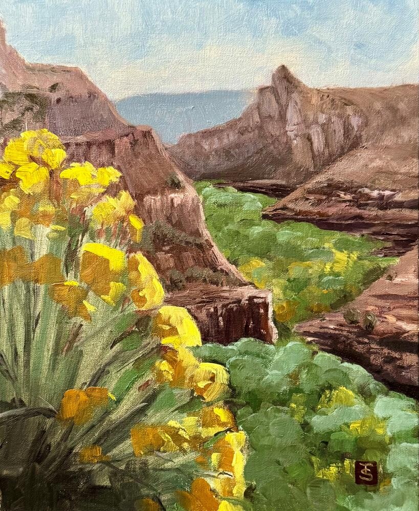 Escalante Canyon was breathtaking at anytime of day but particularly in the morning. This study was done in the parking lot of the coffee shop that overlooks this (which I ate at several times during my stay and highly recommend). The scene just goes on and on for miles into the distance. Down below is a glorious expanse of Cottonwood trees that were just starting to turn in the Fall air. Escalante Canyon was breathtaking at anytime of day but particularly in the morning. This study was done in the parking lot of the coffee shop that overlooks this (which I ate at several times during my stay and highly recommend). The scene just goes on and on for miles into the distance. Down below is a glorious expanse of Cottonwood trees that were just starting to turn in the Fall air. |