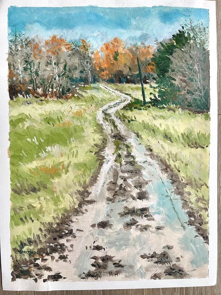 After a day painting in the chill November air, I was driving back to our rental in the Durham area when I came upon this farmer's road moving resolute back into the woods. I could not stop then to paint it as it was getting late, so I took a picture determined to fulfill that promise. After a day painting in the chill November air, I was driving back to our rental in the Durham area when I came upon this farmer's road moving resolute back into the woods. I could not stop then to paint it as it was getting late, so I took a picture determined to fulfill that promise. |