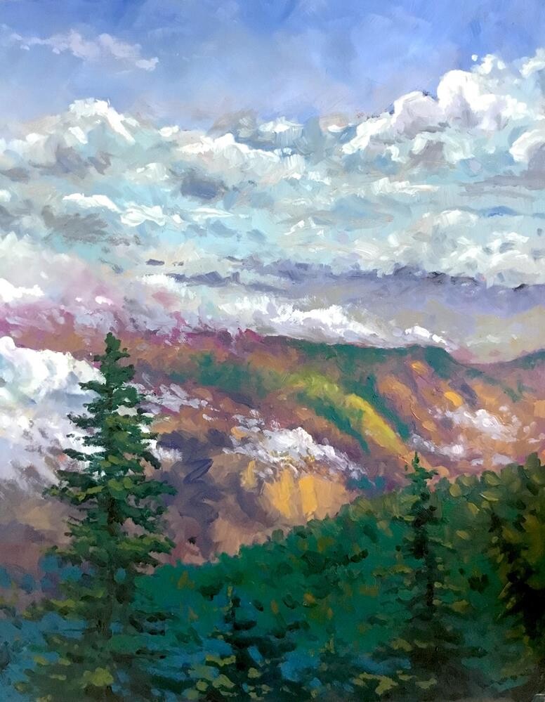 Another painting of the Smokies. Early afternoon and a storm was moving out, leaving narrow passages of sun that lit up the mountains. |
