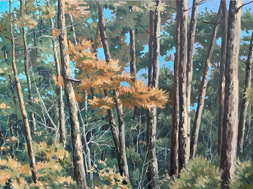 A stand of Southern white pine catching the late afternoon light. I was intrigued by the highlighted textures of the bark and the push and pull of color that pulled you forward and back into the forest.