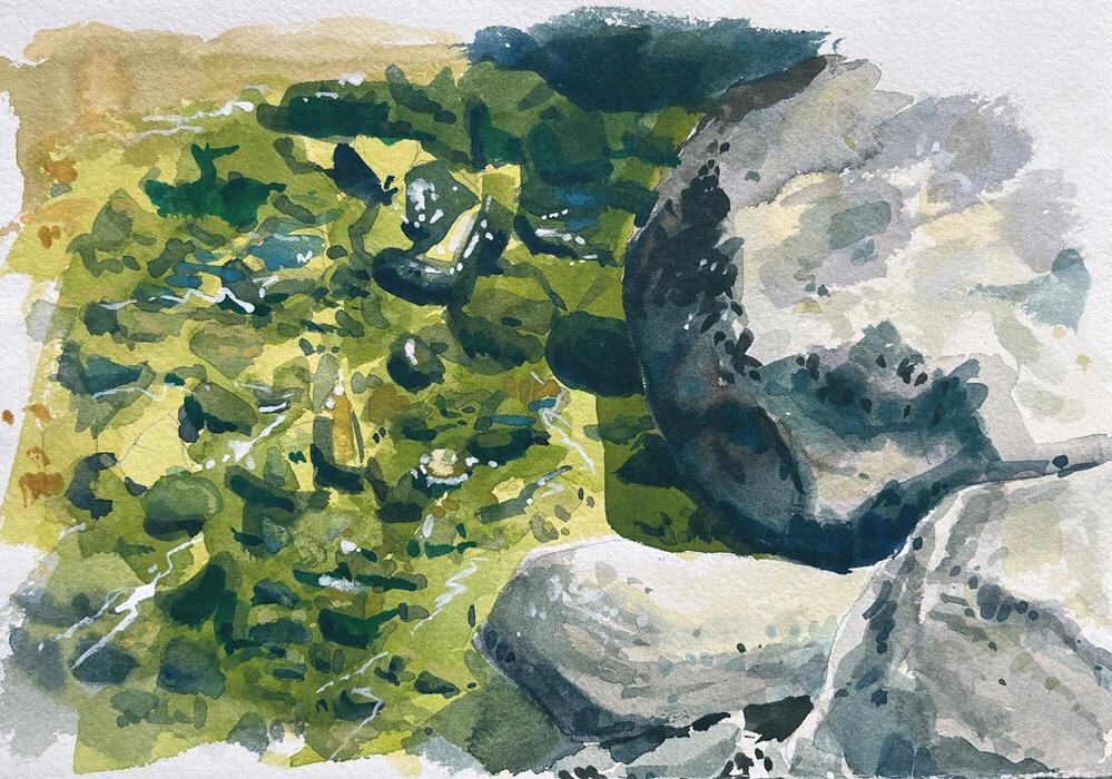 Small plein air watercolor of a stream's edge. Looking for somewhere to paint, I happened upon this small stream. Intrigued by the play of the color from water to dry rock, I sat and quickly captured the moment. Small plein air watercolor of a stream's edge. Looking for somewhere to paint, I happened upon this small stream. Intrigued by the play of the color from water to dry rock, I sat and quickly captured the moment. |