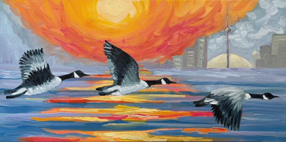 In this painting, I explore the theme of Canada in the Fall through both a natural and symbolic lens. The scene depicts Canadian geese flying across a vast body of water toward the distant Toronto Skyline, with the CN Tower marking the city as distinctly Canadian. Traditionally, geese migrate south as the seasons change, but in this piece, they are "Heading North". This reversal speaks to the current political and social climate, both in Canada and beyond our borders. The geese become metaphors for resilience, independence and the search for safety and stability in uncertain times. "Heading North" invites viewers to reflect on the meaning of home, belonging and direction. In this painting, I explore the theme of Canada in the Fall through both a natural and symbolic lens. The scene depicts Canadian geese flying across a vast body of water toward the distant Toronto Skyline, with the CN Tower marking the city as distinctly Canadian. Traditionally, geese migrate south as the seasons change, but in this piece, they are "Heading North". This reversal speaks to the current political and social climate, both in Canada and beyond our borders. The geese become metaphors for resilience, independence and the search for safety and stability in uncertain times. "Heading North" invites viewers to reflect on the meaning of home, belonging and direction. |