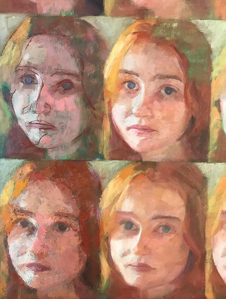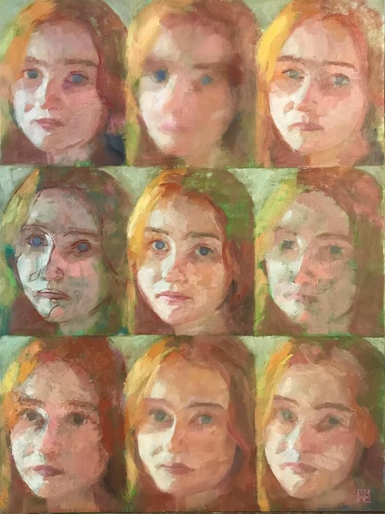 This is a series of 9 portraits painted from the same reference photo (purchased from Stephen Bauman). I brought each to a different level of finish and/or used a different tool to paint them. For instance, the bottom left was painted with a palette knife and the top middle was painted with a really big round brush. The middle one is the most finished of them all. The second image is a closer view of the four at the bottom left. This is a series of 9 portraits painted from the same reference photo (purchased from Stephen Bauman). I brought each to a different level of finish and/or used a different tool to paint them. For instance, the bottom left was painted with a palette knife and the top middle was painted with a really big round brush. The middle one is the most finished of them all. The second image is a closer view of the four at the bottom left. |