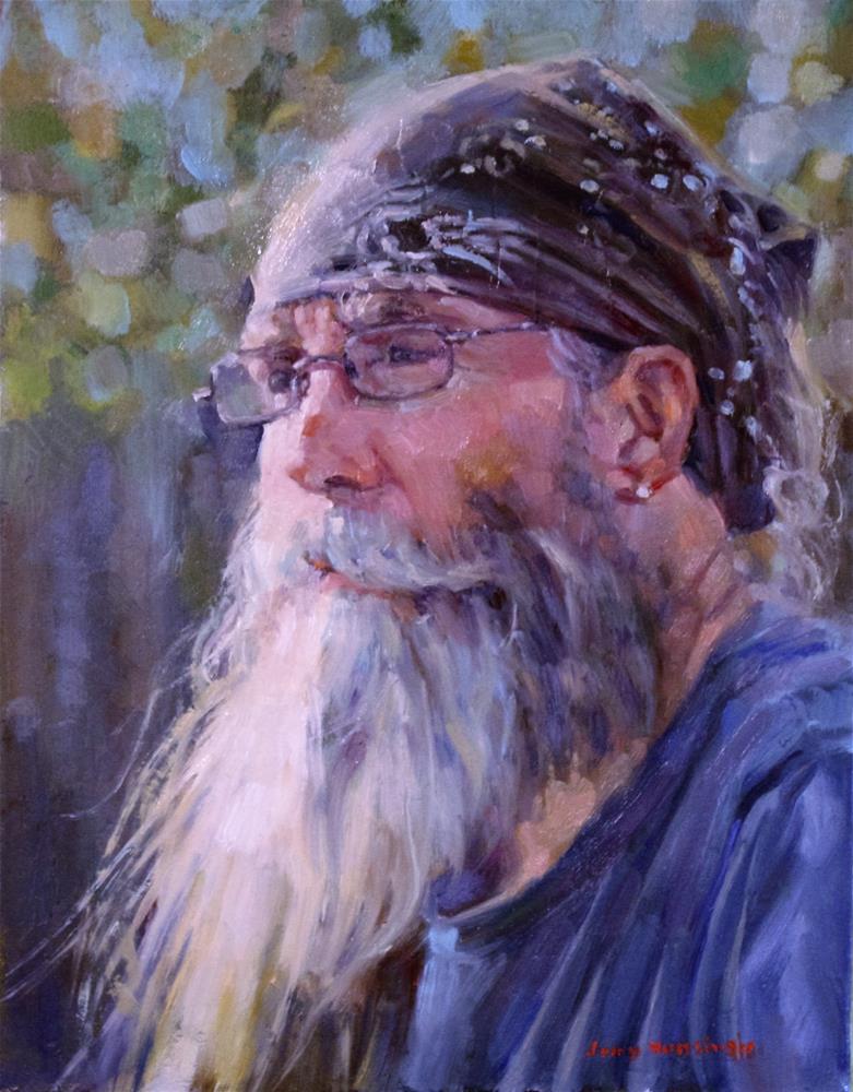 As a portrait artist I am inspired by people who "listen​ to the beat of their own drum"..hence the title. I will probably paint several studies of this man. It was fun to paint and I enjoyed "picking" at the painting as I put final details on it...adding bits of detail and color.