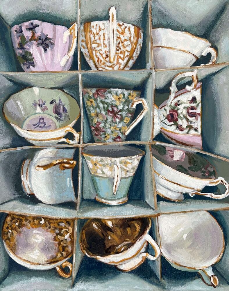 This painting is inspired by my grandmother, who always believed that any problem could be solved over a cup of tea. She would tell me, "Sit down, take a breath, have a sip, and the answers will come to you." Her wisdom has stayed with me and this piece is a tribute to that comforting ritual of tea and reflection. Each teacup has its own unique style and colouring just like the different personalities that gather around a table to share, listen and find solutions together. Nestled in their perfectly fitted slots, they are both individual and part of a whole; a visual reminder that sometimes, the right company and a warm cup of tea are all you need to set things right. This painting is inspired by my grandmother, who always believed that any problem could be solved over a cup of tea. She would tell me, "Sit down, take a breath, have a sip, and the answers will come to you." Her wisdom has stayed with me and this piece is a tribute to that comforting ritual of tea and reflection. Each teacup has its own unique style and colouring just like the different personalities that gather around a table to share, listen and find solutions together. Nestled in their perfectly fitted slots, they are both individual and part of a whole; a visual reminder that sometimes, the right company and a warm cup of tea are all you need to set things right. |
