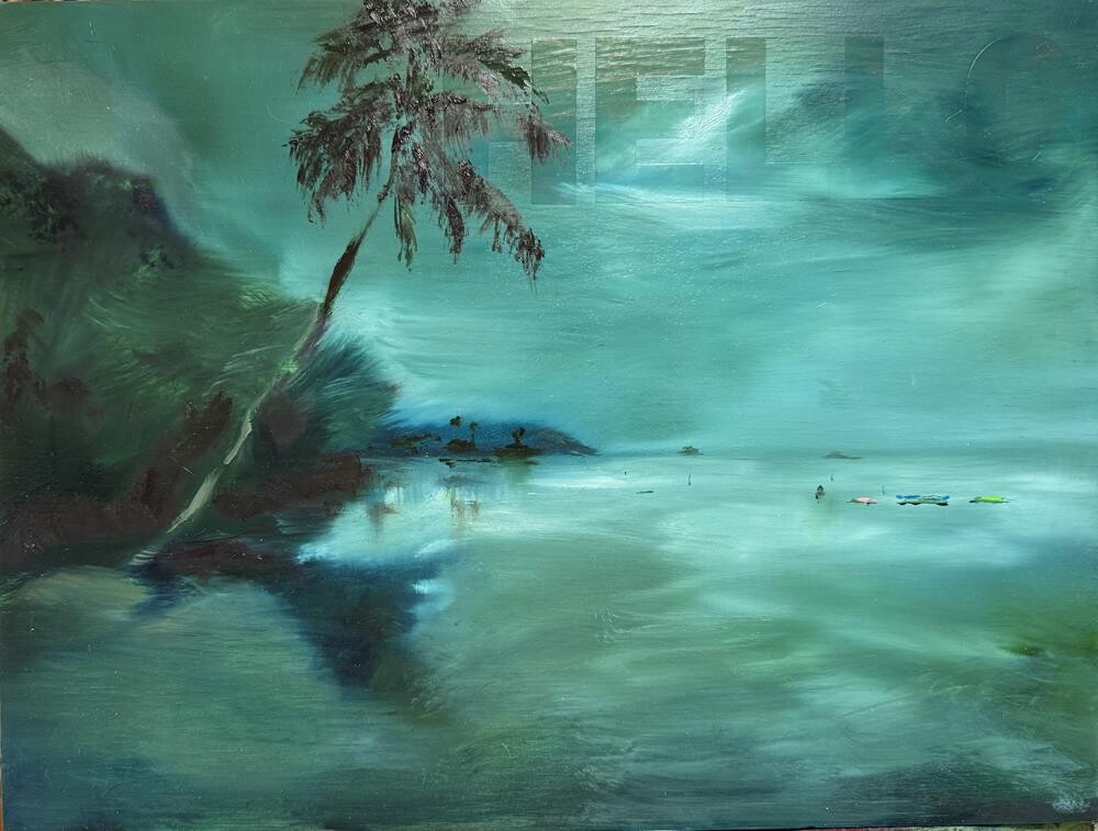 Originally a photograph, generously granted by @atmospherics for me to use as inspiration for this painting, is a surreal scene indeed. I love this "moodscape" in cool colors... The painting started with an under layer in neon green, then lettering in HELLO was added and painted over. As the viewer walks by, and as the light shines on the almost imperceptible height of the letters, "HELLO" may or may not reveal itself to you. It is a private dialog between viewer and painting. Oil on wood panel, mounted on blue mirror, framed in wood and glass Originally a photograph, generously granted by @atmospherics for me to use as inspiration for this painting, is a surreal scene indeed. I love this "moodscape" in cool colors... The painting started with an under layer in neon green, then lettering in HELLO was added and painted over. As the viewer walks by, and as the light shines on the almost imperceptible height of the letters, "HELLO" may or may not reveal itself to you. It is a private dialog between viewer and painting. Oil on wood panel, mounted on blue mirror, framed in wood and glass |
